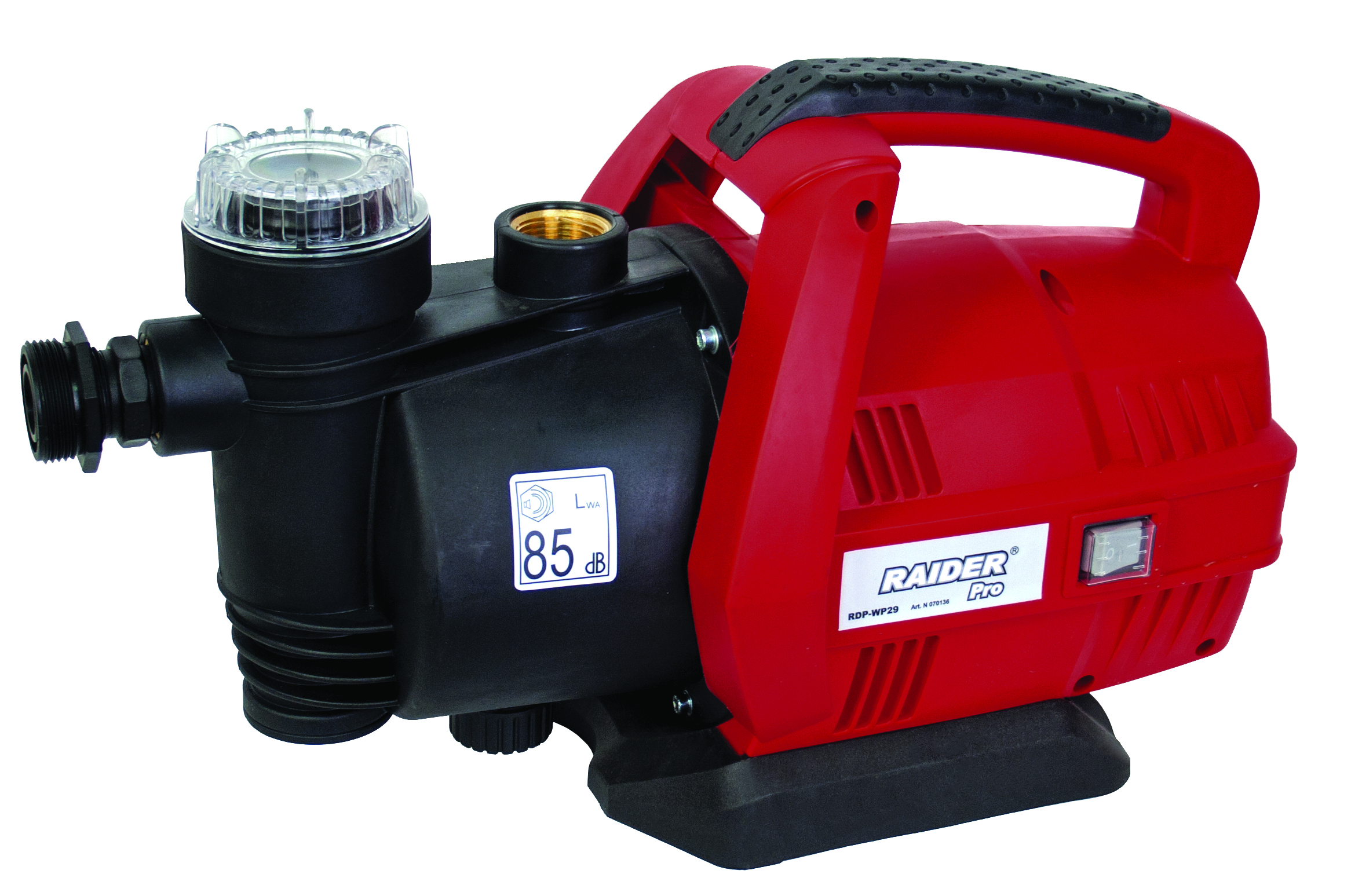 Водната помпа RDP-WP29 е с елегантно изработена от пластмаса тяло. Разполага с удобна ръкохватка, осигуряваща лесното и пренасяне. Управлението на електродвигателя е защитено срещу проникване на влага. Възможност за съвместна работа с електронния пресостат на Raider RD-EPC02
