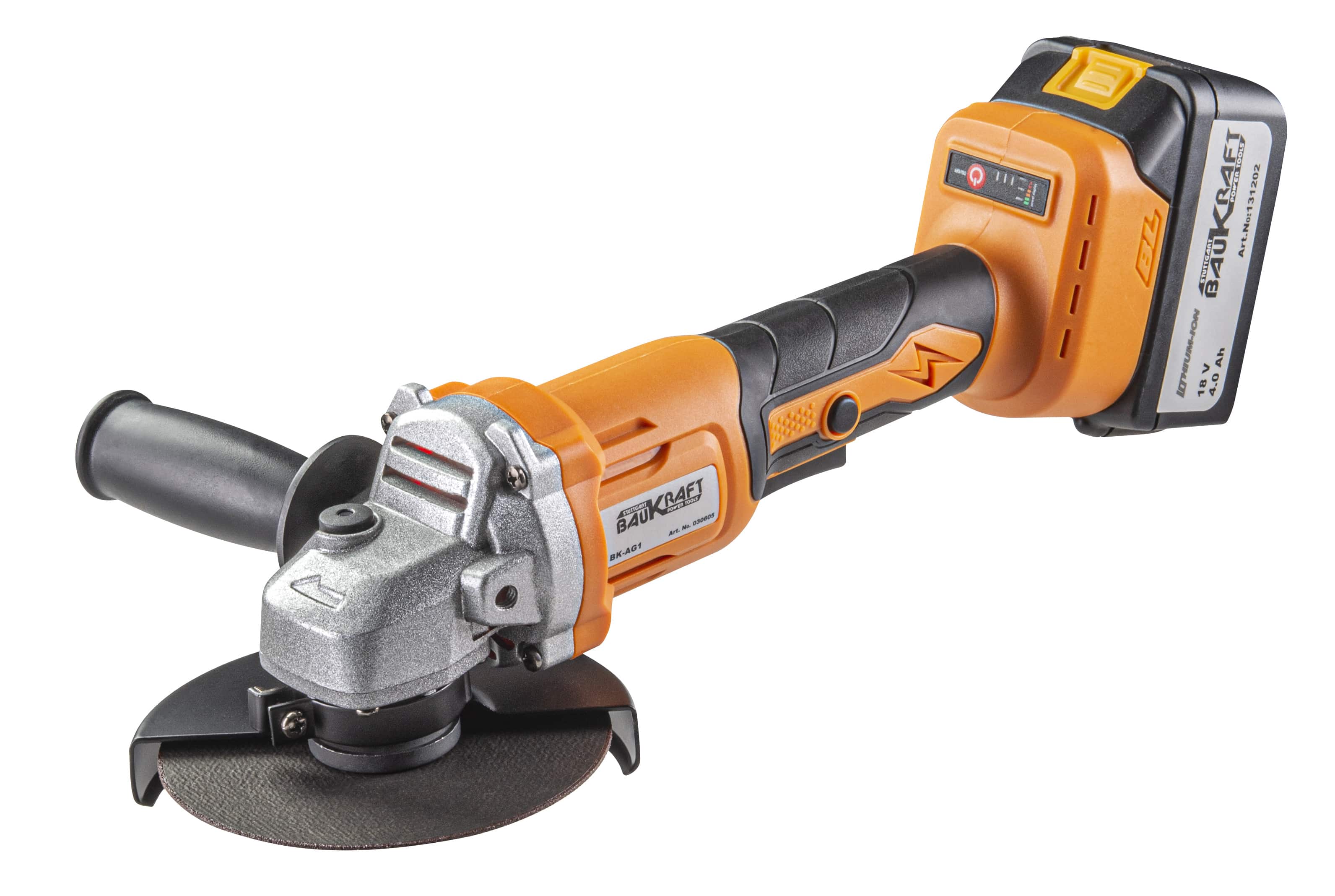 Безчетковия ъглошлайф е снабден с безчетков мотор, който осигурява над 80% по-висок коефициент на полезно действие. Този коефициент е изключително важен при акумулаторно захранваните инструменти, защото позволява с до 30% по-продължителна работа с едно зареждане на батерията. Диаметъра на диска е 125 mm. Разполага с индикатор за скоростта и за нивото на батерията. Зарядното устройство 18V е съвместимо с литиево-йонни батерии Baukraft.