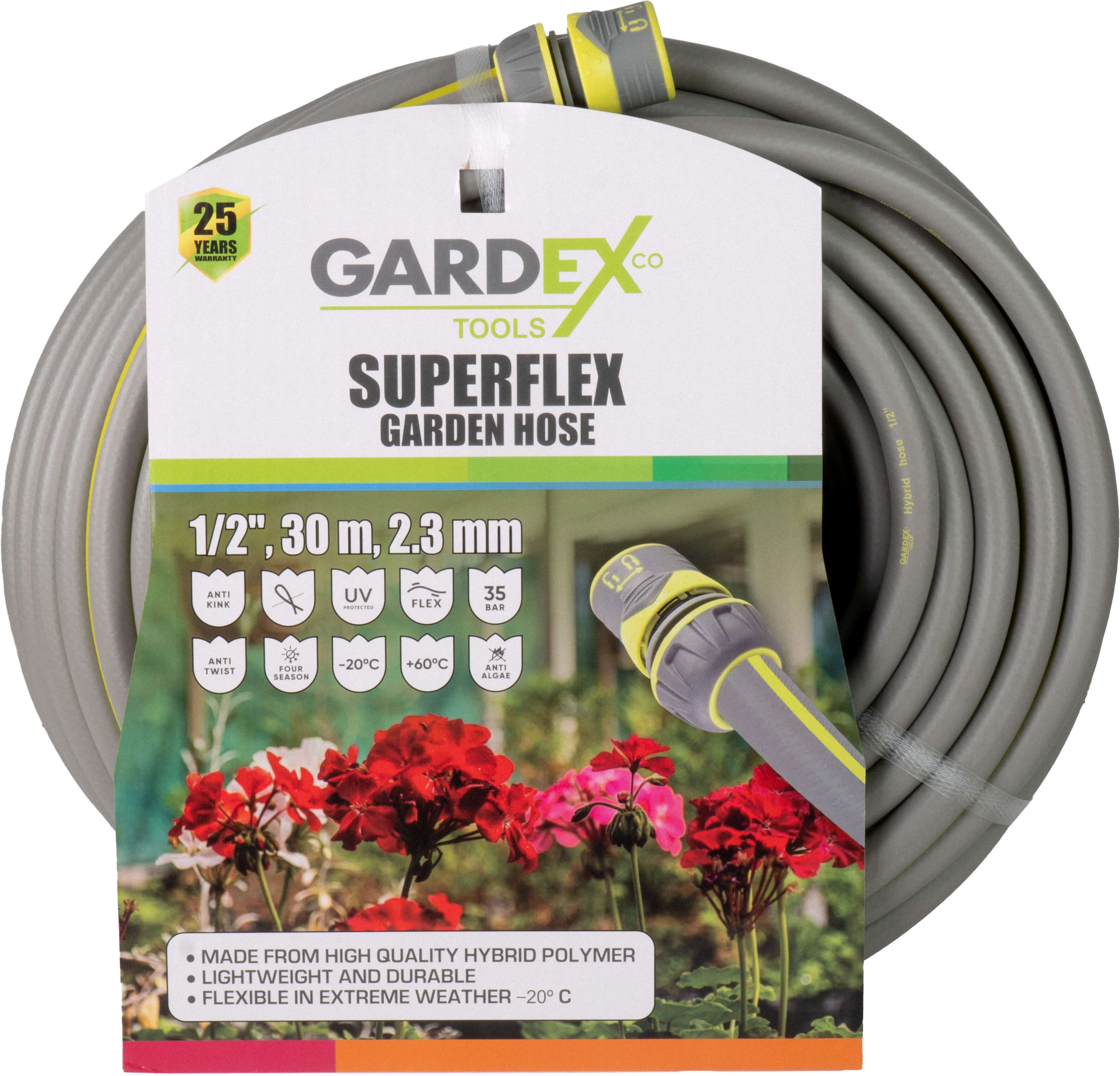 • Изключително издръжлив и многофункционален: градинският маркуч от серията SuperFlex е проектиран за съвършенство. Изработен от хибридизиран полимер, той се противопоставя на конвенционалните PVC материали. С температурна устойчивост от -20 °C до +60 °C, този маркуч вирее при екстремни климатични условия. Независимо дали е изпепеляващо лятно слънце или мразовити зимни утрини, маркучът SuperFlex остава гъвкав и надежден.
