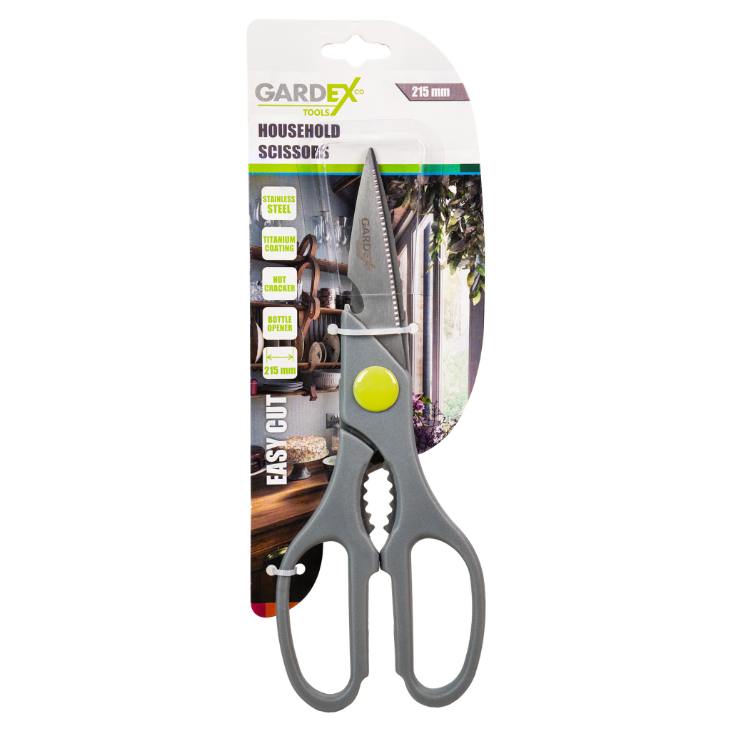 Домакинската ножица EASY CUT GX е практичен и многофункционален инструмент, създаден за удобство и ефективност при ежедневни задачи в кухнята и домакинството. Изработена от висококачествена неръждаема стомана с титаниево покритие, тя осигурява отлична издръжливост, прецизно рязане и дълготрайна острота. Благодарение на вградените допълнителни функции като орехотрошачка и отварачка за бутилки, ножицата се превръща в незаменим помощник за всяко домакинство.