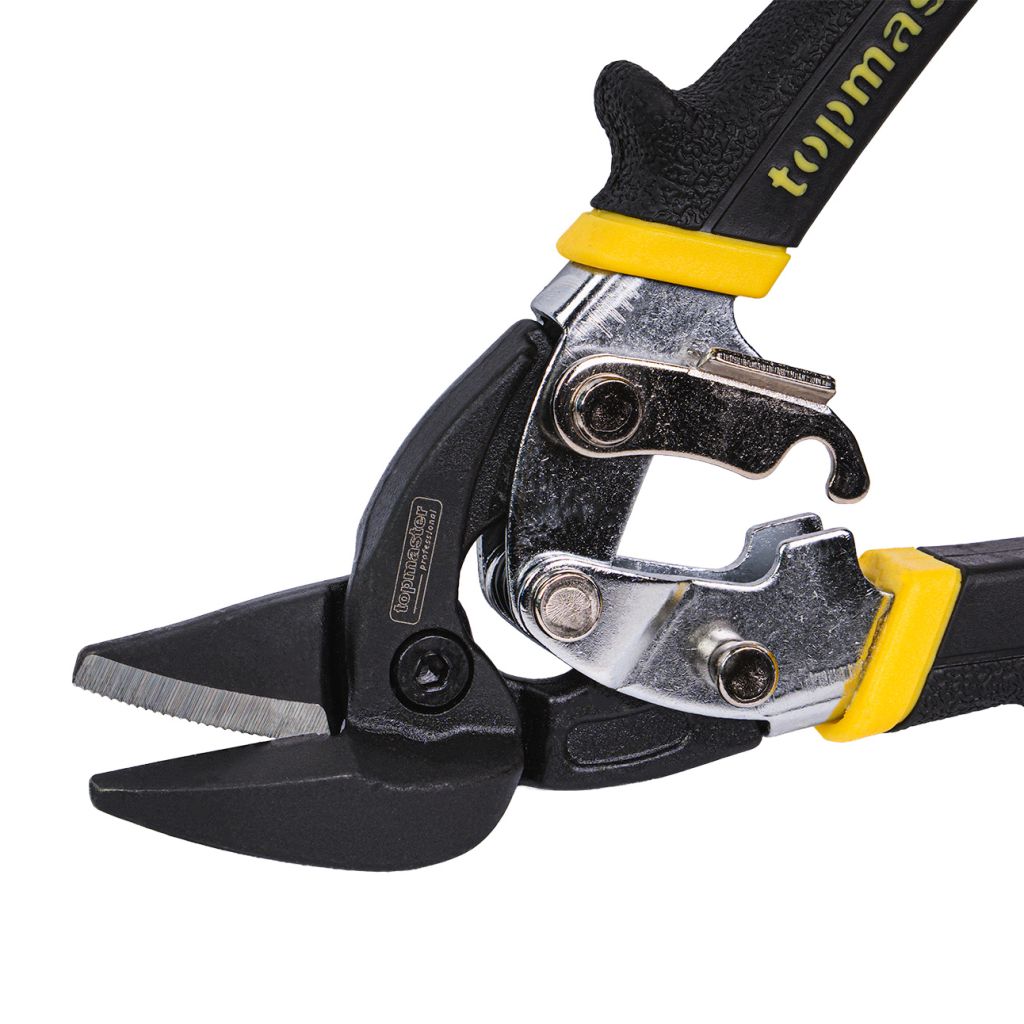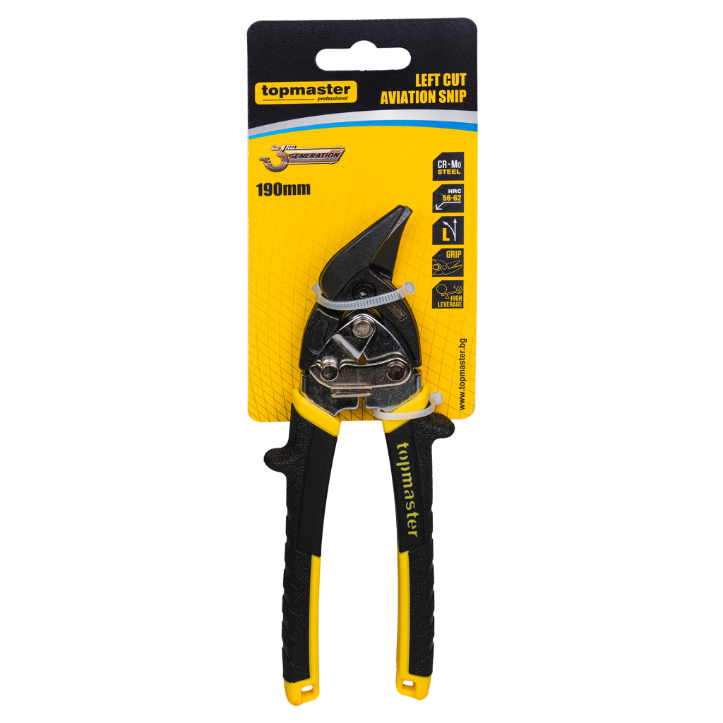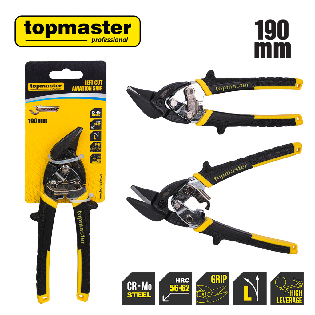 Усилената лява ножица за ламарина Topmaster (TMP) е предназначена за прецизно и ефективно рязане при интензивна употреба. С дължина 190 mm, тя е специално проектирана за криволинейни разрези вляво, изрязване на контури, отвори и различни форми, като осигурява отлична видимост на линията на рязане и стабилен контрол.