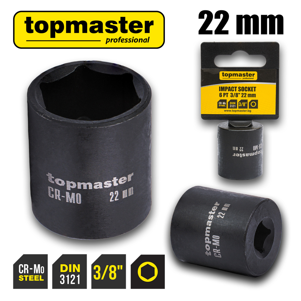• Ударната вложка TMP 3/8" x 22 mm е изработена от високоякостна Cr-Mo хром-молибденова стомана, термично обработена по стандарт 3121.