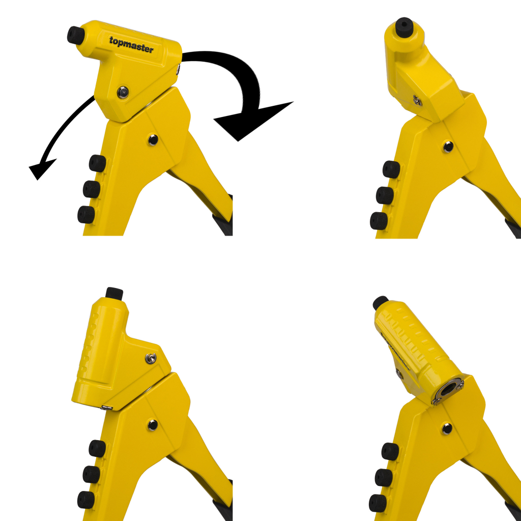 A pop riveter with a rotating head is a tool that allows riveting in various materials such as metal, plastic and others