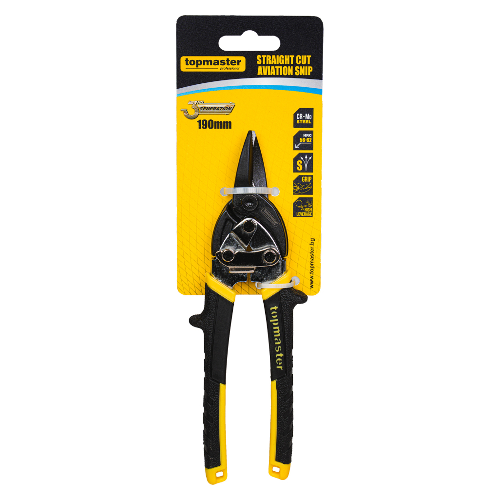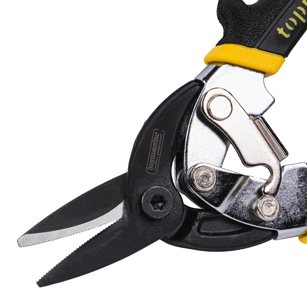 The reinforced Topmaster (TMP) sheet metal snips are designed for precise and efficient cutting under intensive use. With a length of 190 mm and straight cutting blades, they provide excellent control and a stable grip on the sheet metal, ensuring clean and accurate cuts.