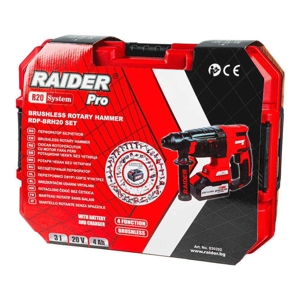 The model is part of the Raider R20 System cordless family, allowing the same battery to be used across all R20 series tools. The machine is compatible with different battery capacities from the R20 range, offering flexibility, cost optimization, and extended runtime. The set includes a 4Ah battery and a durable carrying case for convenient storage and transport.
