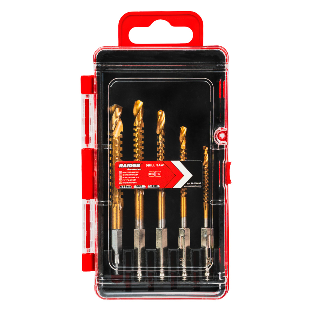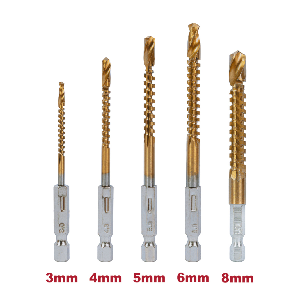 • The HSS+TiN drill-milling bit set includes 5 high-quality tools with diameters Ø 3, 4, 5, 6, and 8 mm, designed for drilling and milling holes in various materials. Made from high-speed steel (HSS) and coated with titanium nitride (TiN), these bits provide long life, reduced friction, and more efficient performance even under intensive use.