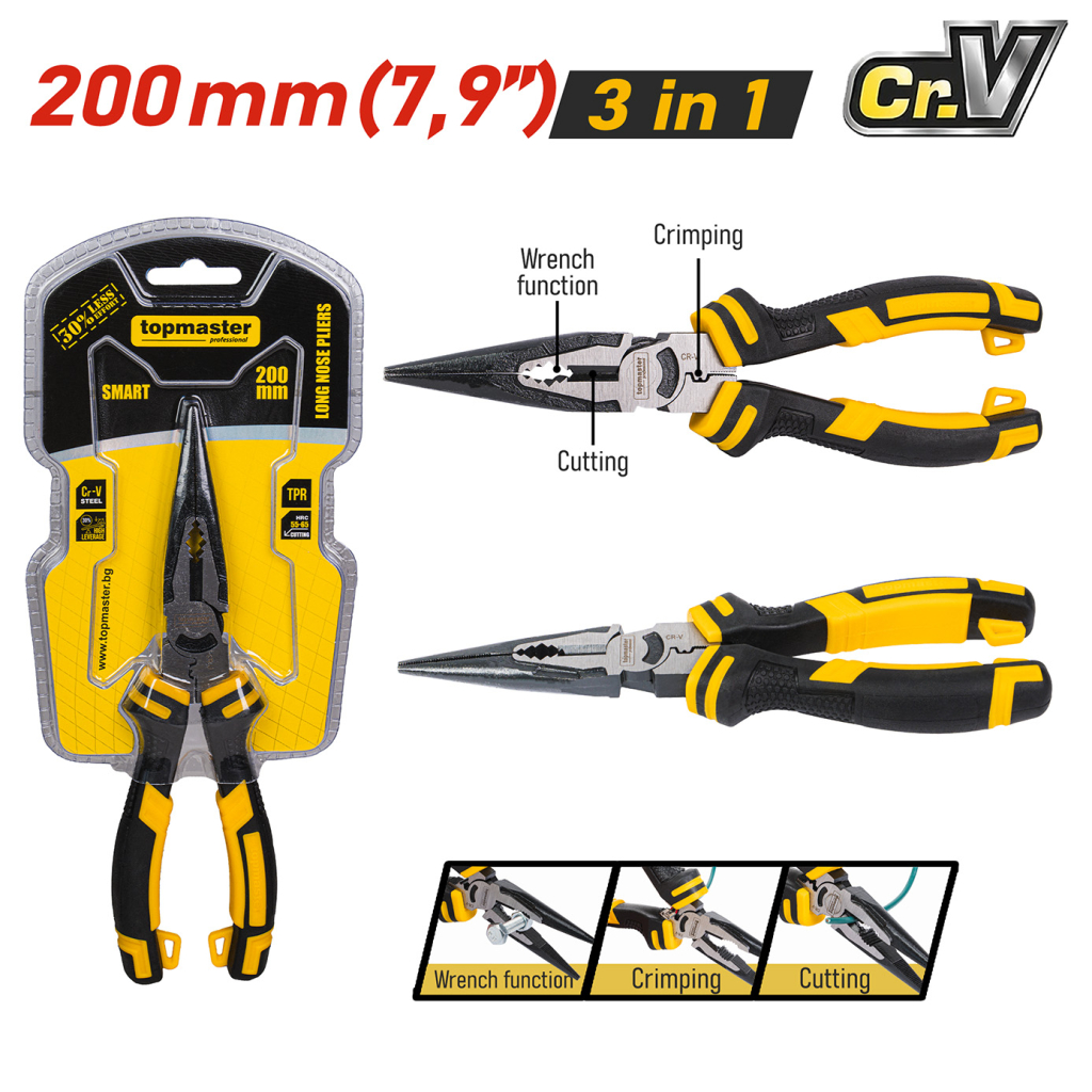 Клещите дългоусти SMART 200 mm TMP са надежден и висококачествен ръчен инструмент. Благодарение на по-голямата си дължина те осигуряват по-добър достъп и по-голям контрол, което ги прави отличен избор както за професионалисти, така и за домашни майстори.