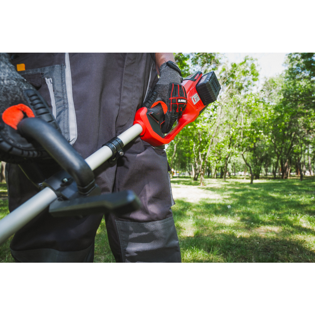 • "R20" brushless trimmer is a powerful and convenient tool for garden maintenance. It has a special design that ensures easy and comfortable operation. The machine is equipped with a knife and a cord that allow the user to choose the appropriate method for trimming the grass
