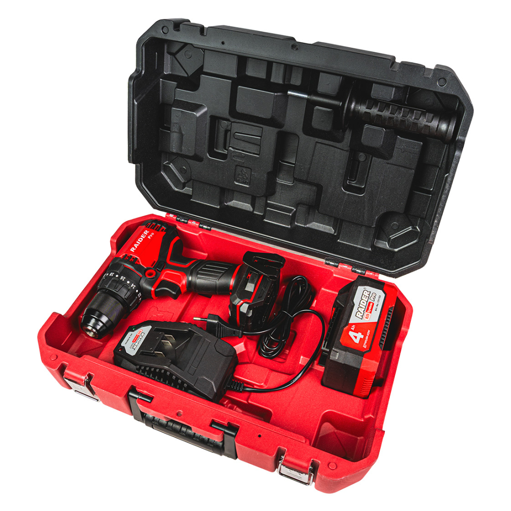 RDP-YBID20 R20 Masina de gaurit cu percutie, motor fara perii, 2 viteze, mandrina 13 mm, 60 Nm, cu baterie 4Ah, incarcator si cutie combinata un motor fara perii puternic, functie de percutie, performanta ridicata si durabilitate crescuta, fiind potrivita pentru gaurirea in materiale dure precum caramida, lemn, metal, precum si pentru lucrari de insurubare solicitante.